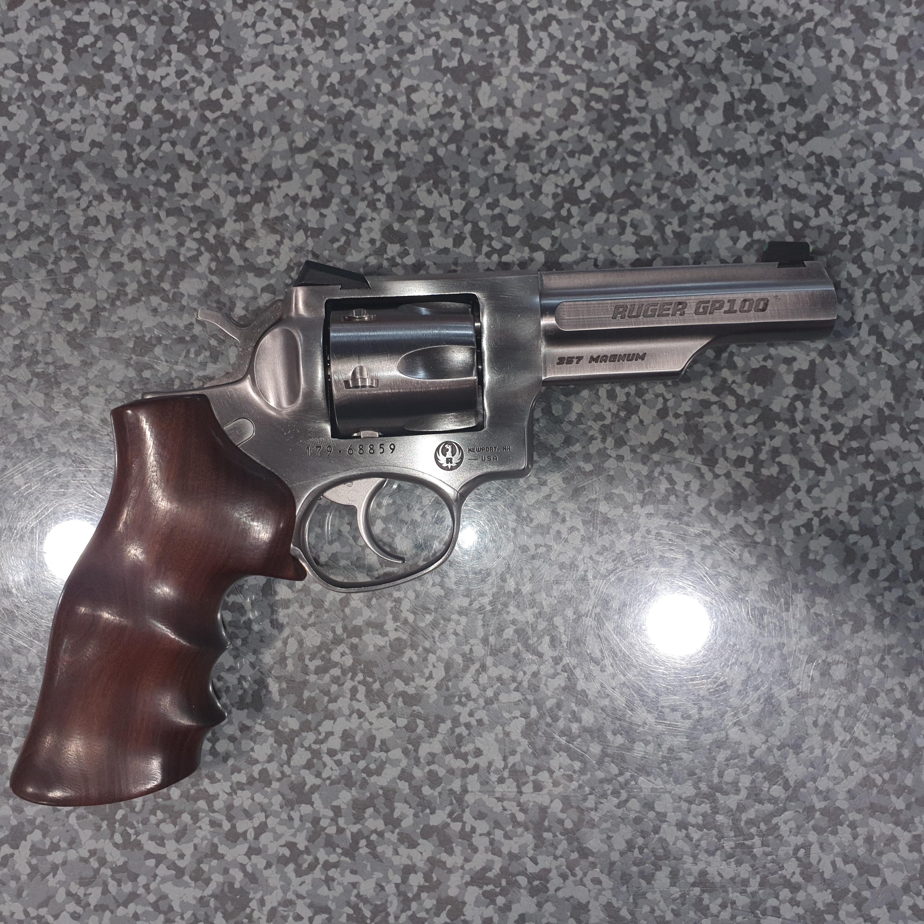Ruger GP100 with original case, paperwork and aftermarket grips.