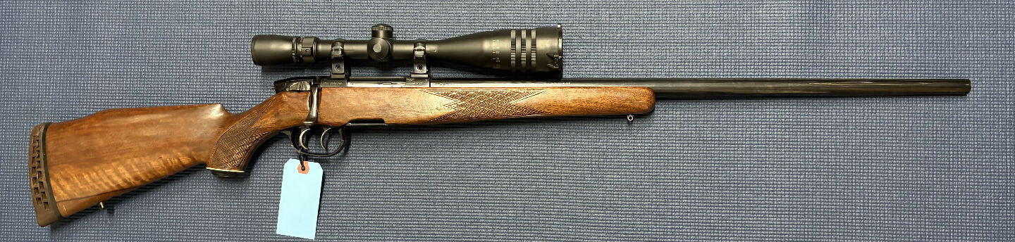 Excellent condition Steyr Luxus 243W. Heavy barrel, beautiful stock, twin triggers, clear Weaver 6-24x42 scope, spoon handle bolt.
