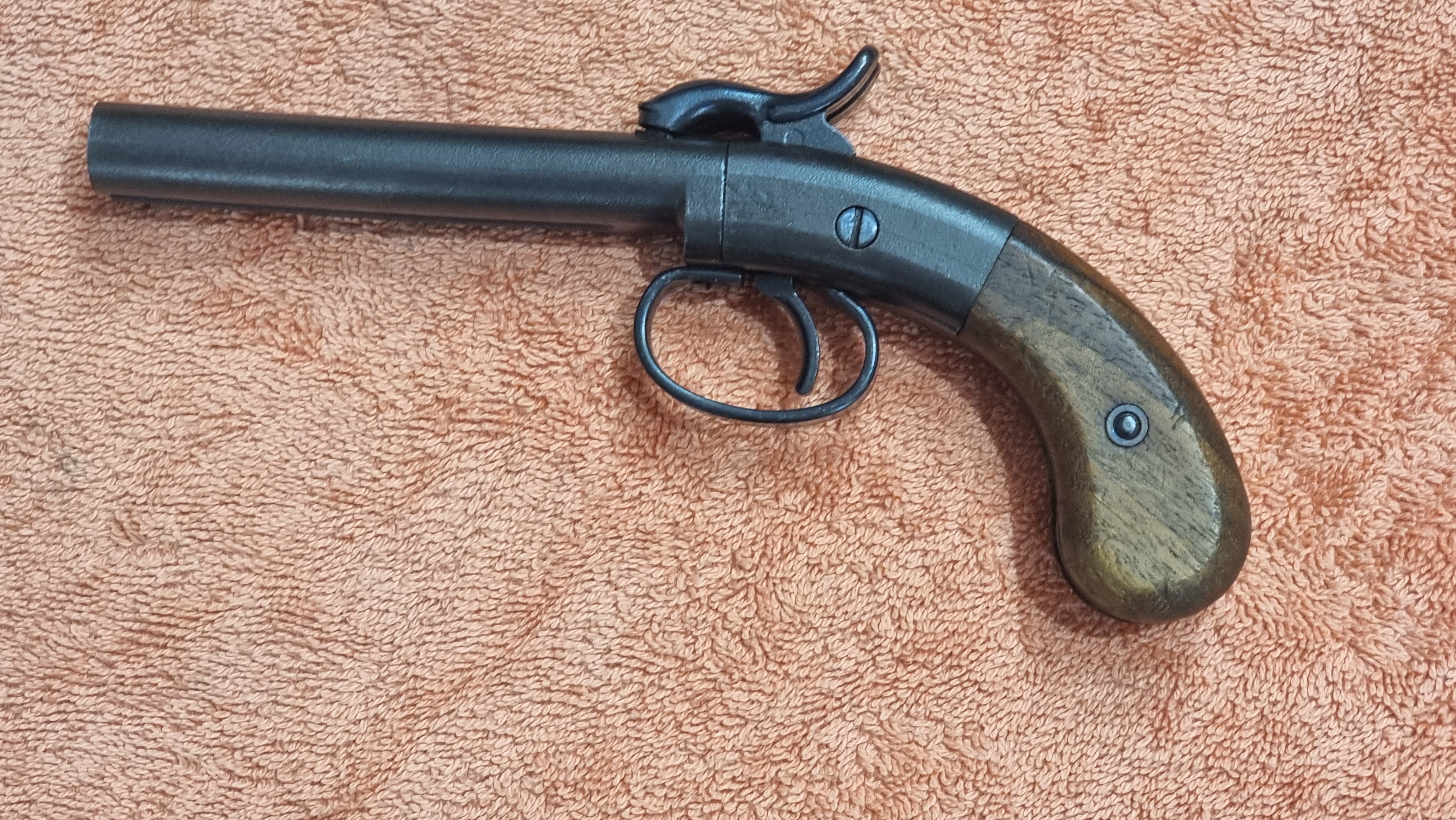 This is replica percussion cap double barrel pocket pistol. The finish is very good no marks or scratches. Grips are excellent no chips or cracks. Functions very well, good trigger action. Selling as need space in safe. Price does not include Dealer's Fees or Postage.