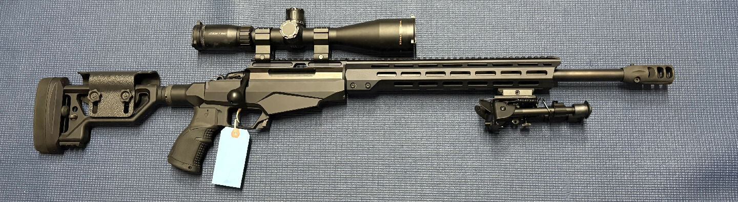 Tikka T3x in 308W. Setup for long range target shooting. Has a muzzle brake, bipod and buttstock ready for a monopod if needed. Scope optically as new. Call the shop for more info. Excellent Condition.